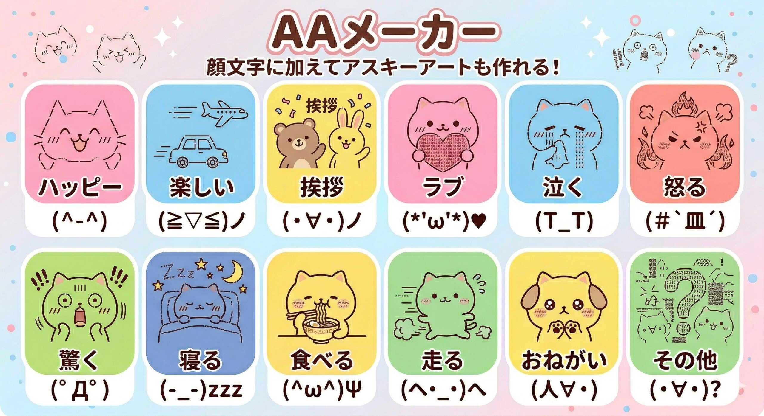 Xで使えるミニAAを探している人も、LINEやDMで送れる長文AAをコピペしたい人も、このページからまとめて使えます。短くて崩れにくいAA、返信やあいさつに使いやすいミニAA、誕生日やお祝い、ありがとうの気持ちをしっかり伝えられる長文AAまで、使いやすいものを見つけやすいように整理しました。タップするだけでコピーできるので、X、LINE、DM、メッセージアプリなどでそのまますぐ使えます。
